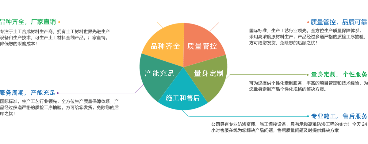 公司所有產品均采用國際標準組織生產,并經國家、市技術監(jiān)督局采標驗收,生產工藝及水平全國領先,屬國內優(yōu)等水平,實物質量達到國際先進水平。經用戶、施工單位使用證明,質量穩(wěn)定可靠、施工方便、價格合理、售后服務完善。產品主要應用于農業、海綿城市建設、公路、鐵路、垃圾填埋場防滲,水利、電力、水土保持及環(huán)境綠化與基礎建設領域,已被廣泛應用于高速公路、鐵路、垃圾填埋場等多項國家重點工程,受到工程界專家及廣大用戶的一致好評。